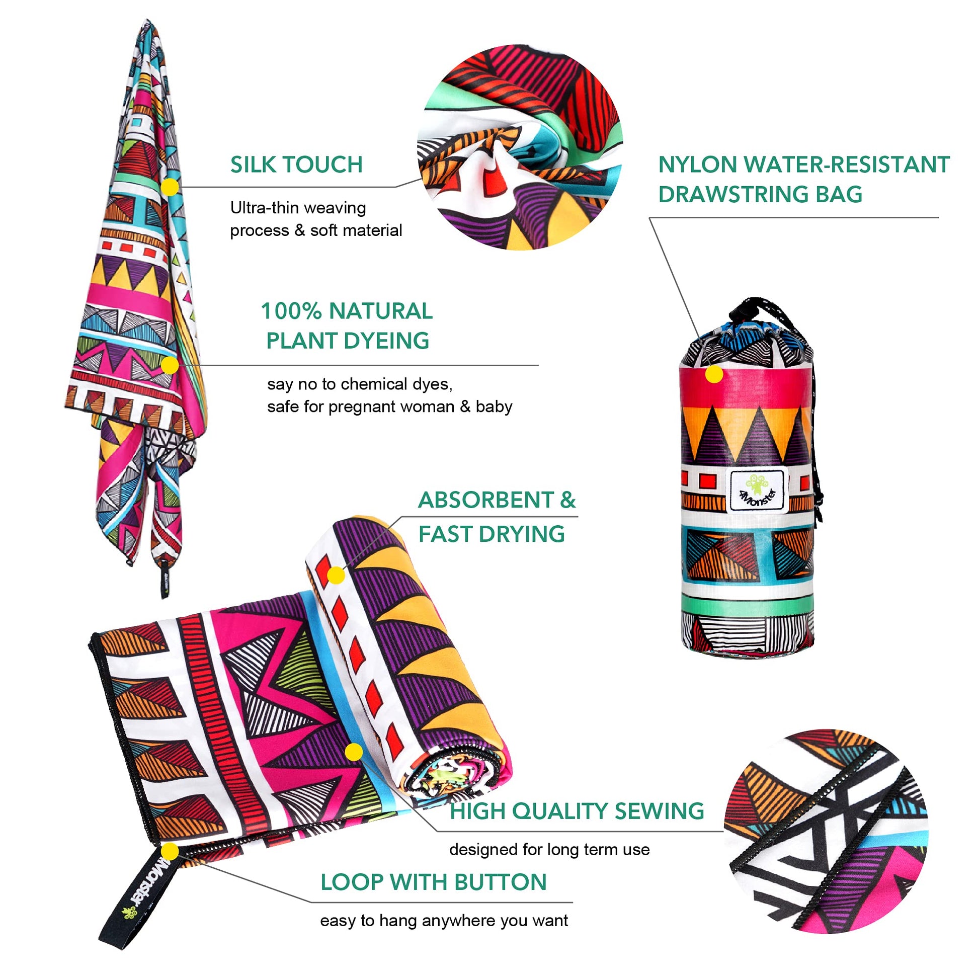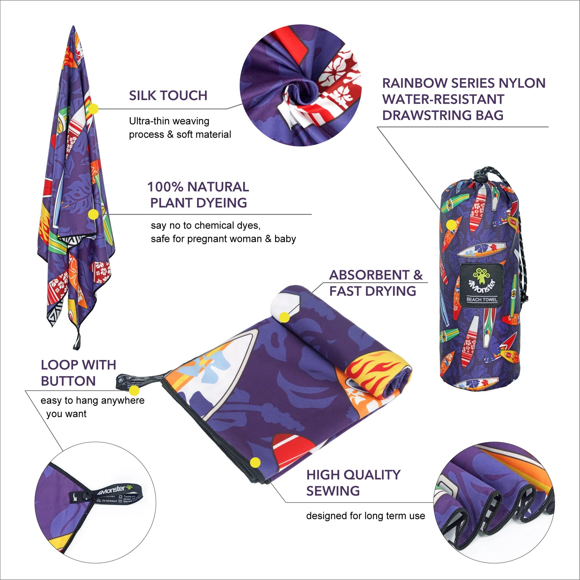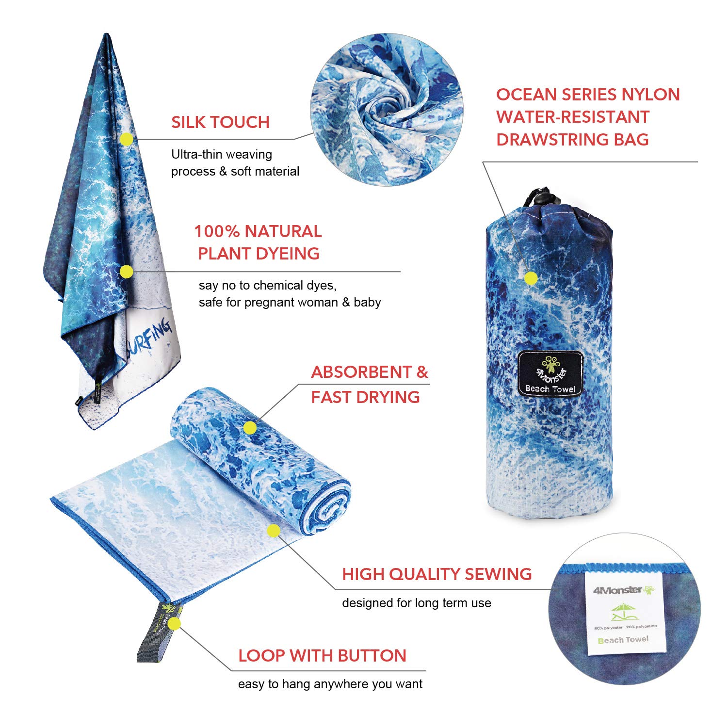 SL Travel Gear - 4Monster Microfiber Beach Towel Quick Dry,Super Absorbent Lightweight Travel Towel for Swimmers, Sand Free Camping Towel, Beach Towels for Pool, Swim, Water Sports,Yoga,Gym,Backpacking