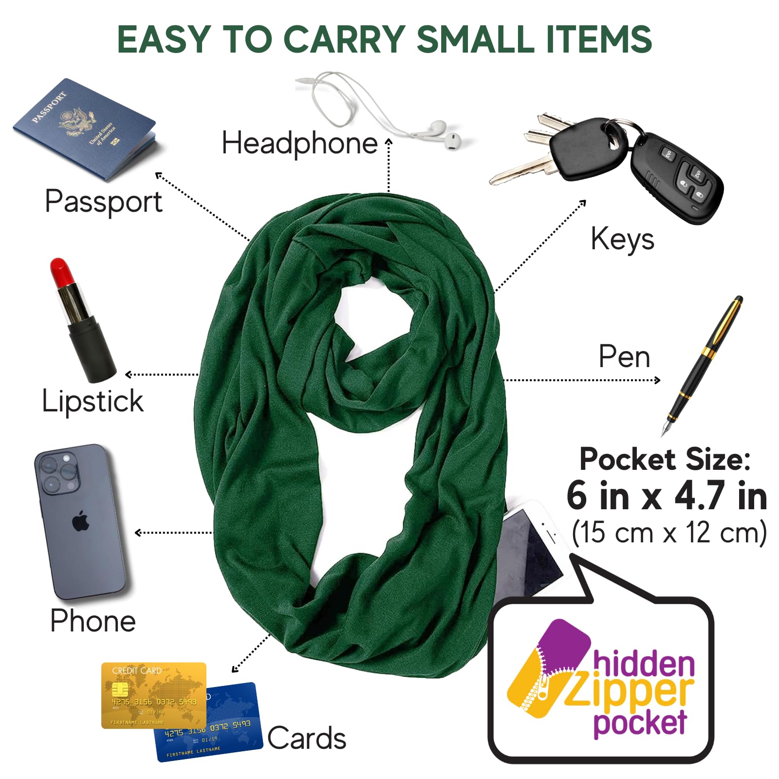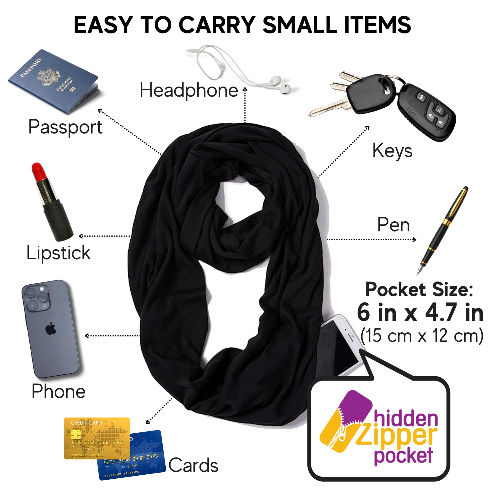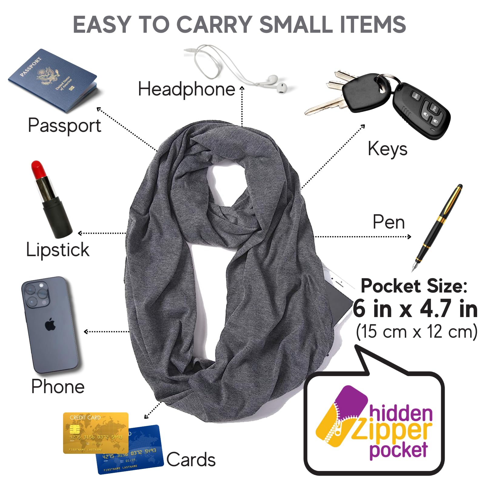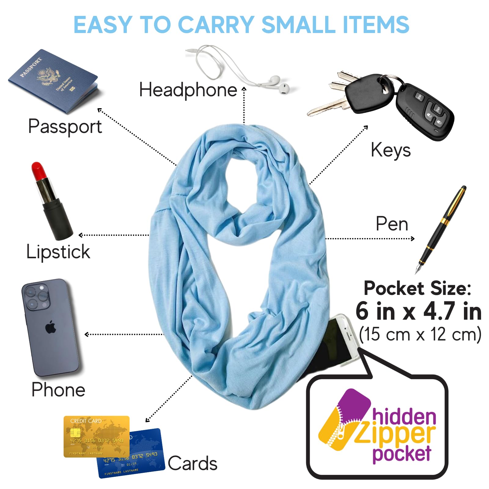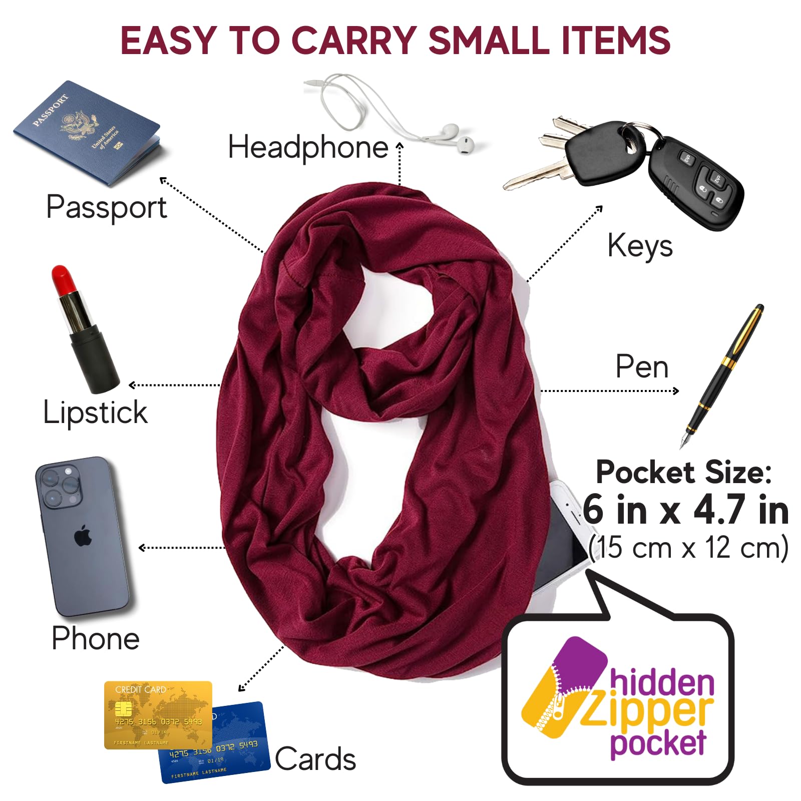 Infinity Loop Solid Color Scarf With Hidden Zipper Pocket For Women - Lightweight Travel Neck Wrap
